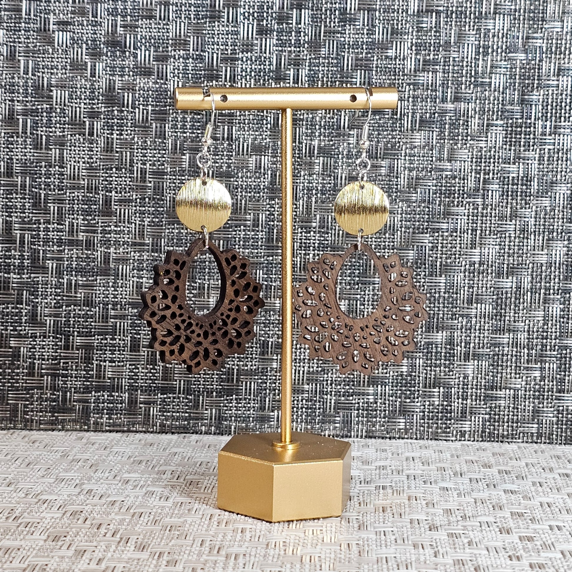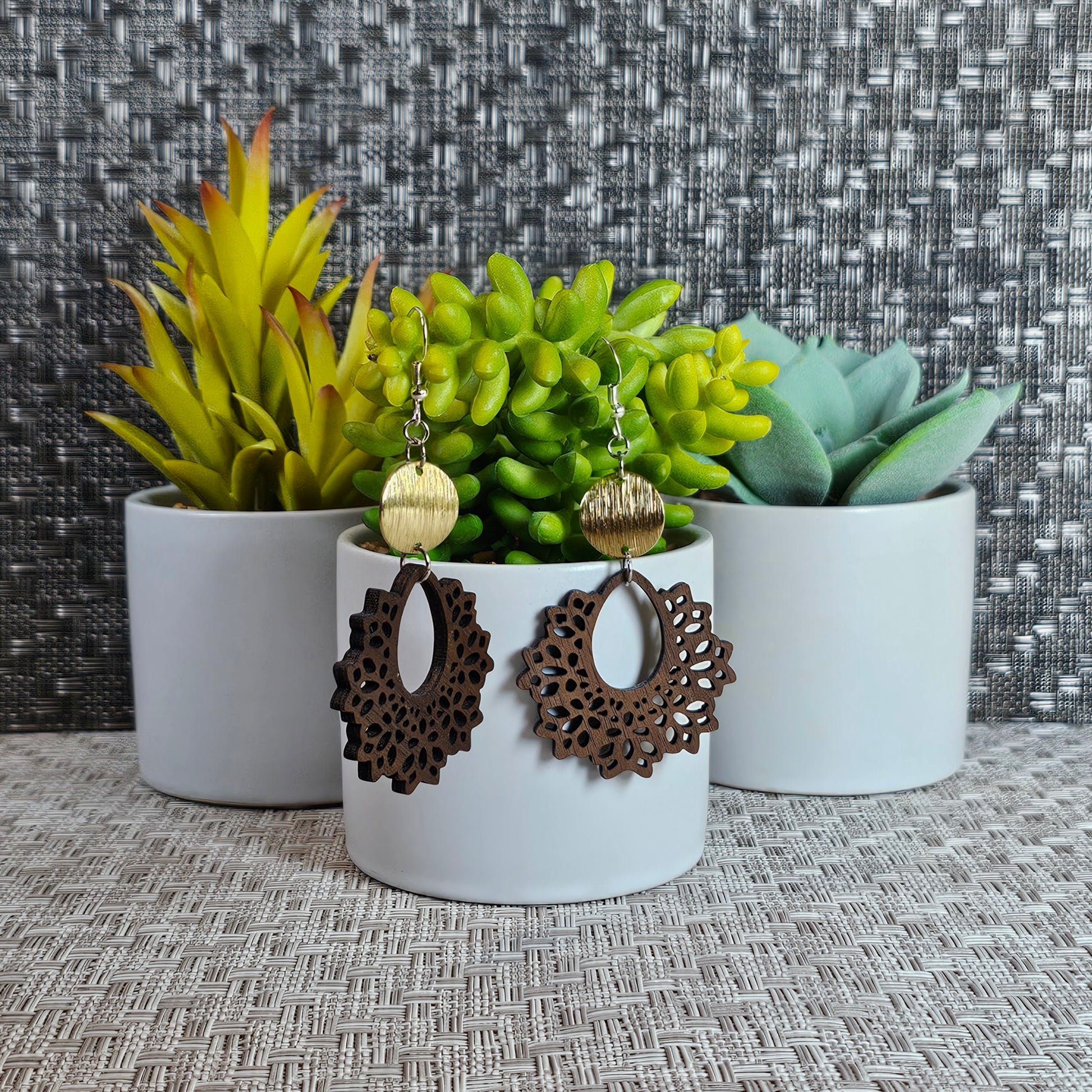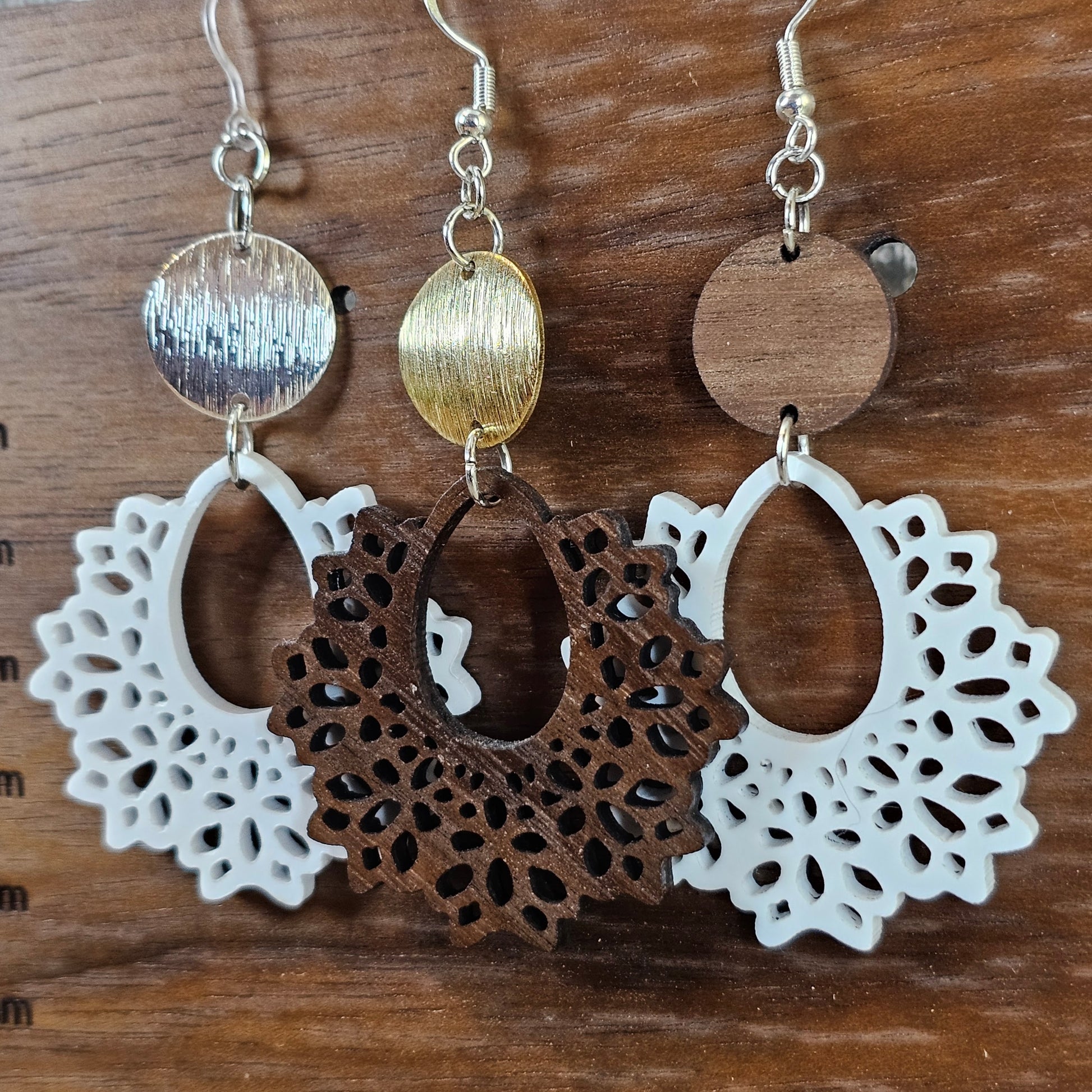 Delicate, bright, and detailed, these lovely doily style lace earrings get noticed. Laser cut from acrylic, they are super light and comfortable to wear and are finished off with sterling silver ear hooks and brass or walnut connectors.