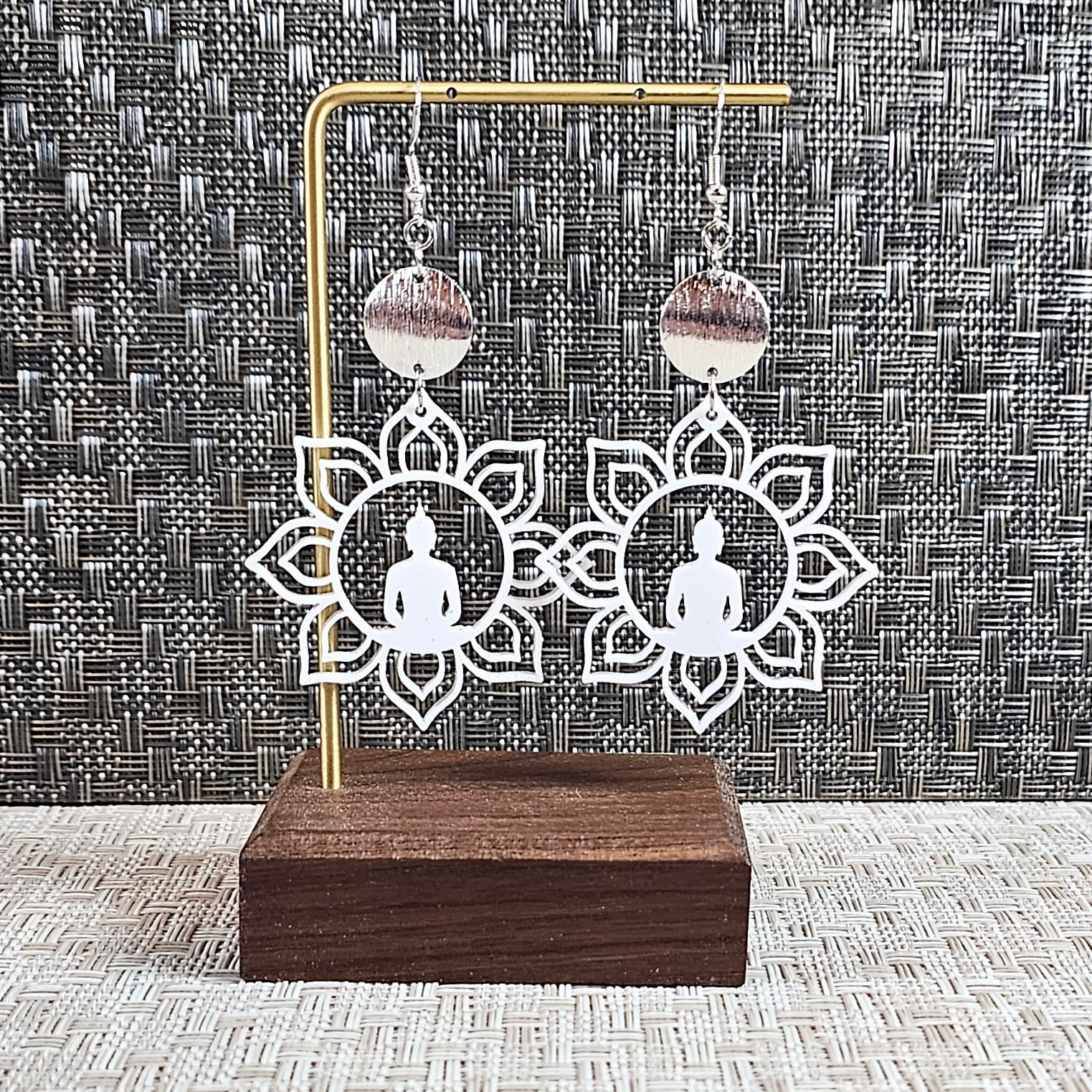 Enlightenment, meditation, peace. Beautiful feelings that these earrings will inspire. Laser cut from acrylic, they are super light and comfortable to wear and are finished off with sterling silver ear hooks and brass or walnut connectors.
