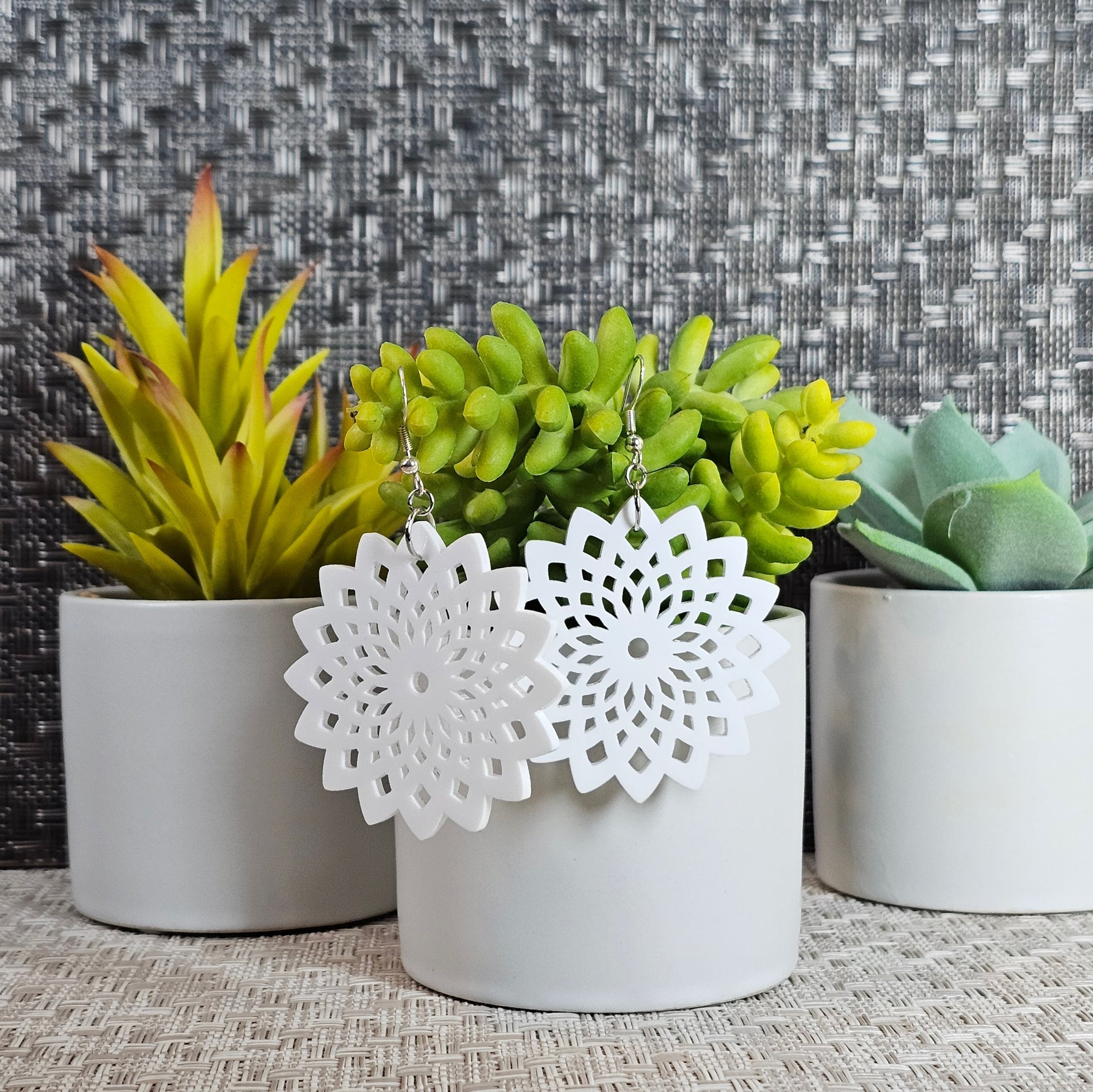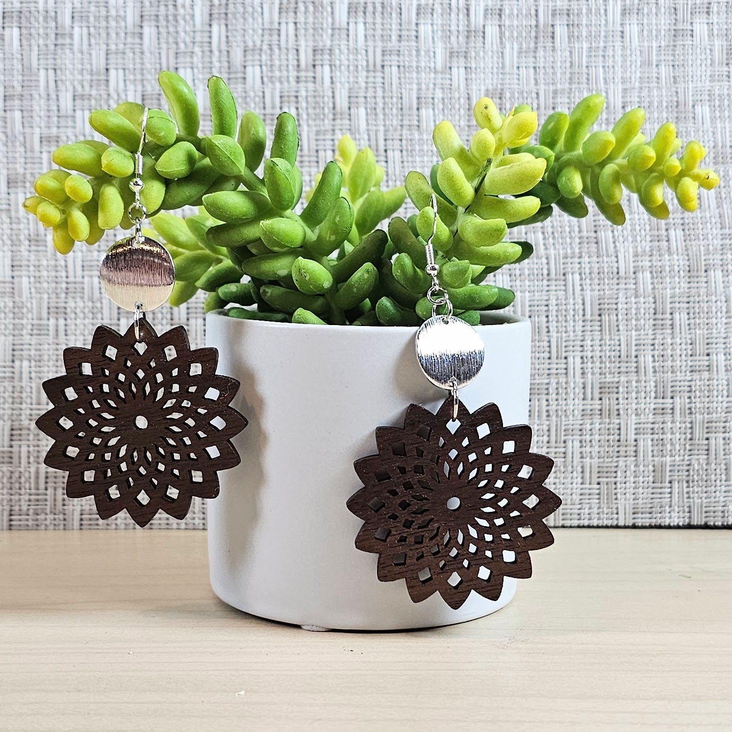 Intricate and mesmerizing, the beautiful pattern reminiscent of a swirling pattern these earrings make a statement. Laser cut from acrylic or walnut, they are super light and comfortable to wear and are finished off with sterling silver ear hooks and brass or walnut connectors.