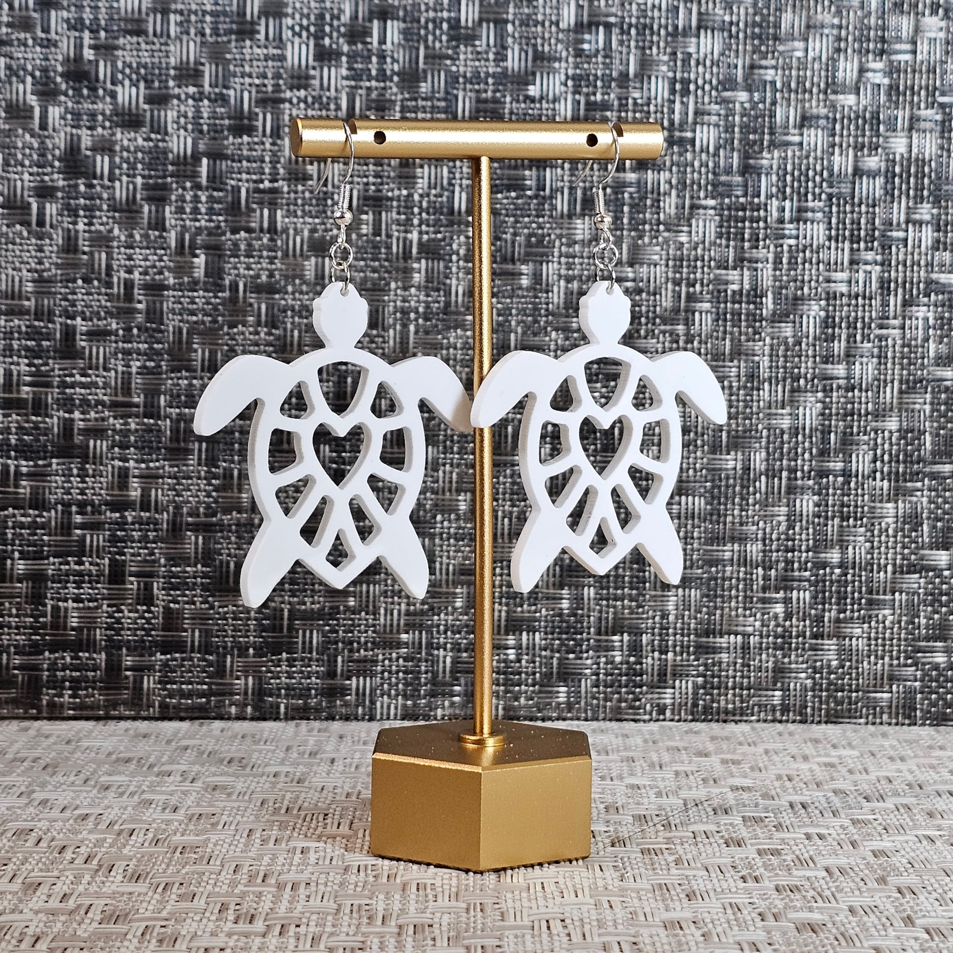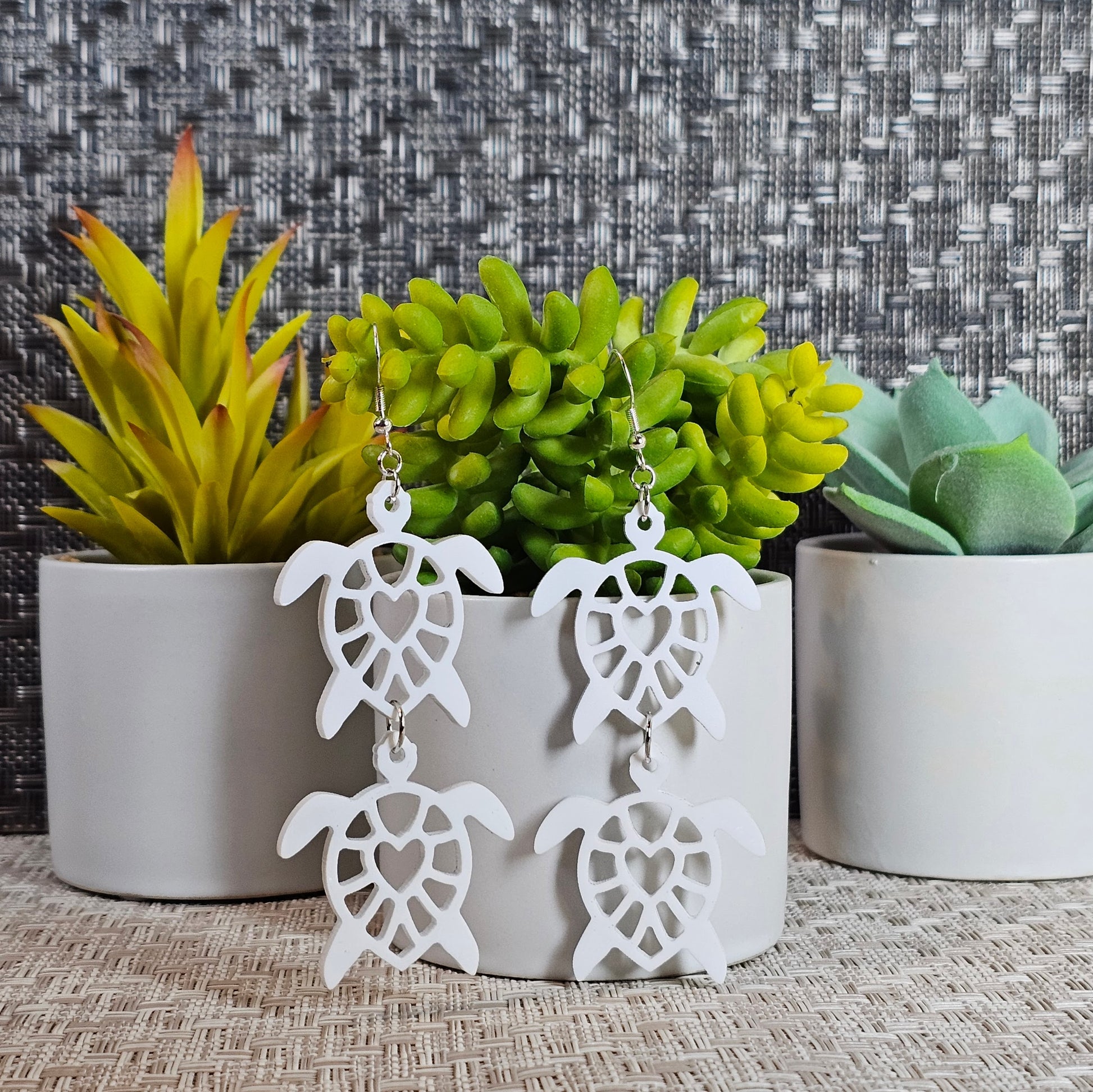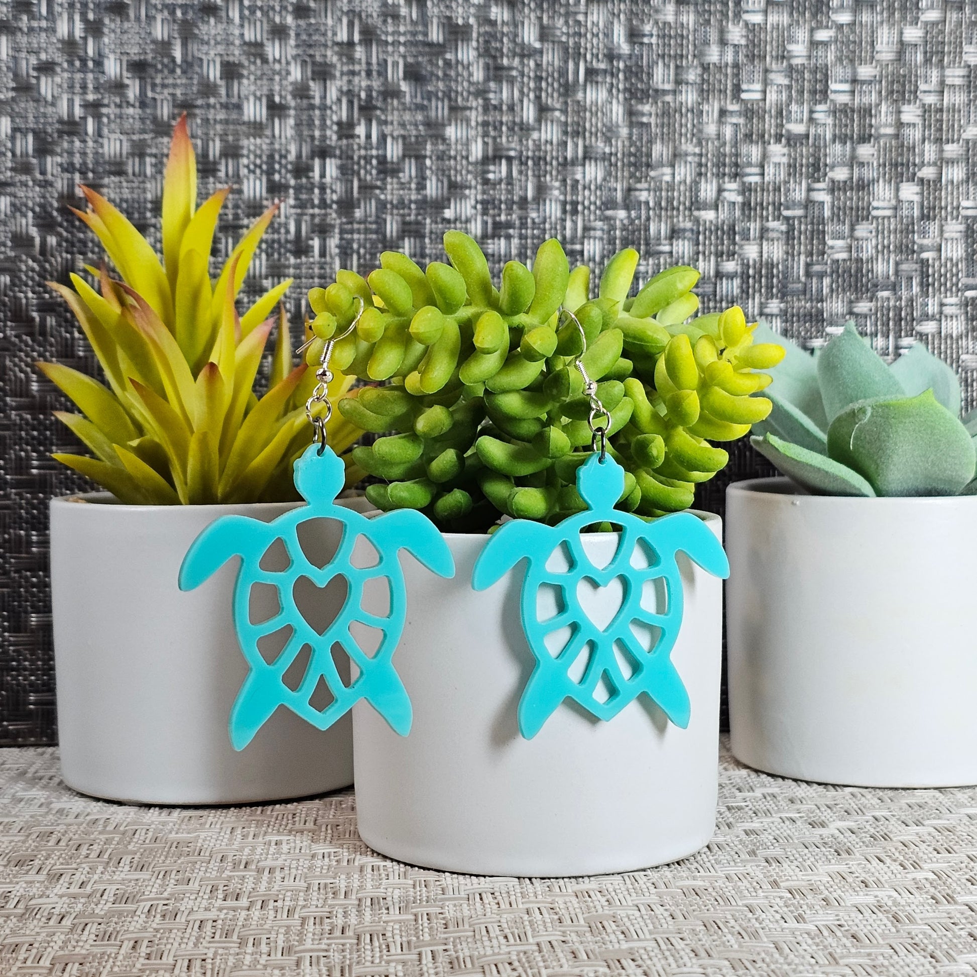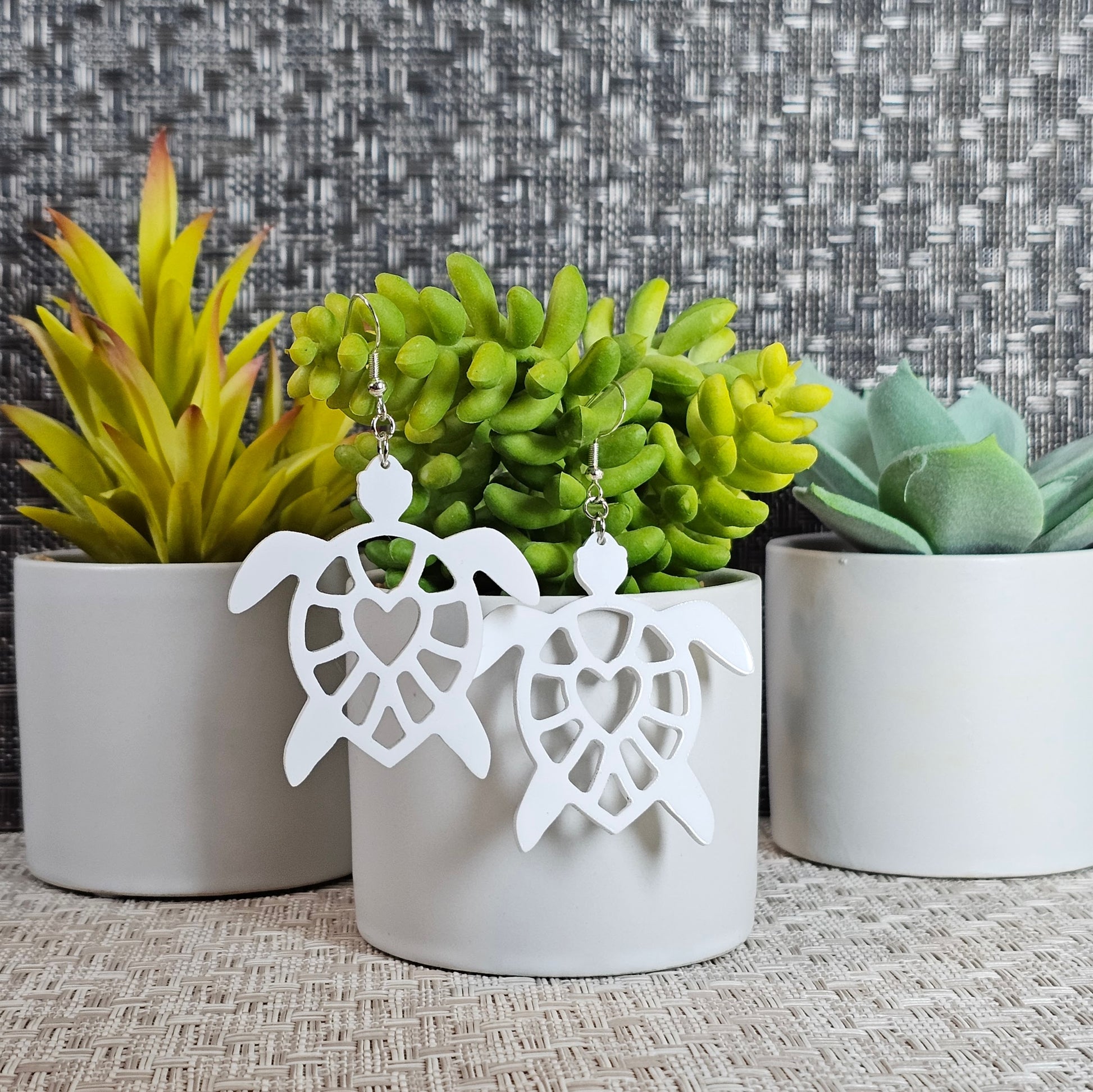 Sweet turtle earrings for the feeling of a breath of summer. Laser cut from acrylic, they are super light and comfortable to wear and are finished off with sterling silver ear hooks.